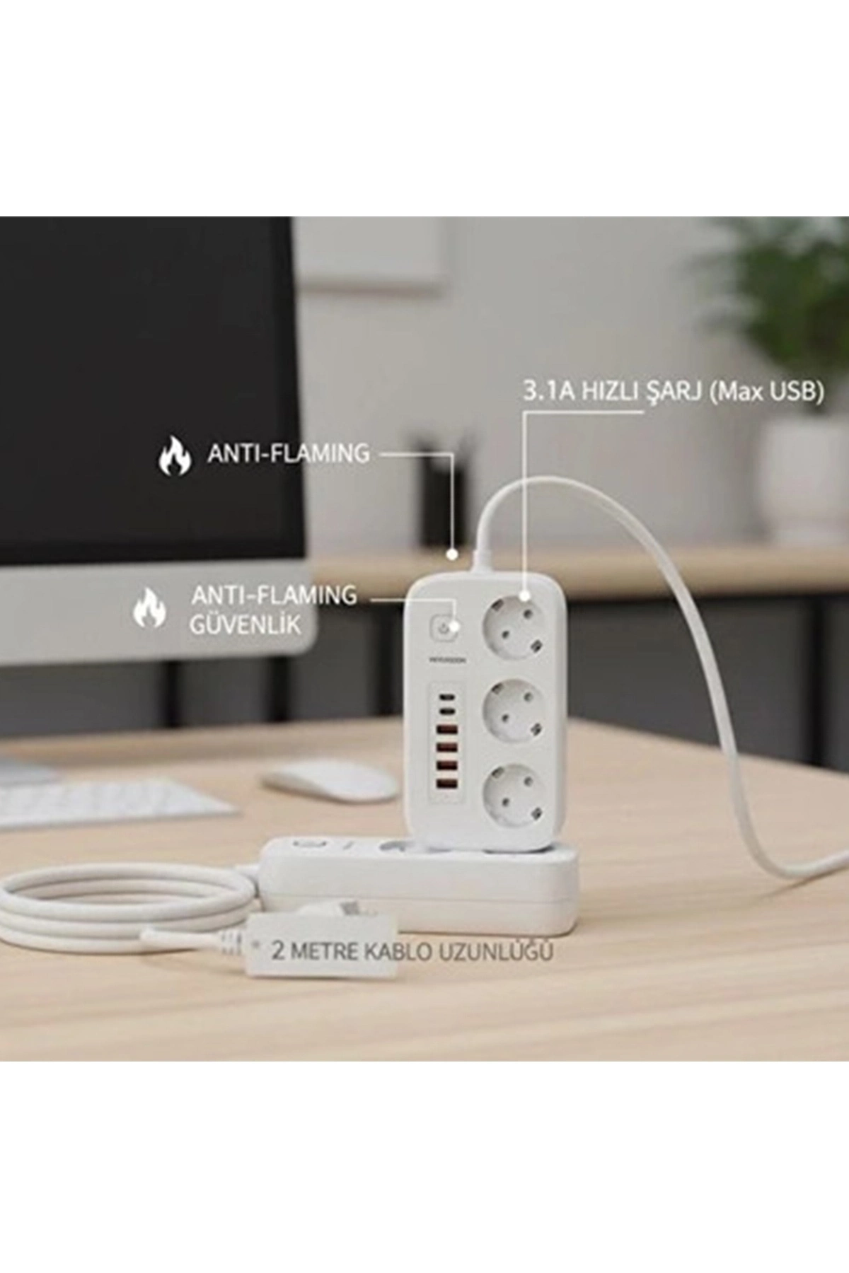 Akım Korumalı Priz ve Masaüstü Şarj İstasyonu Kablosuz 3 Priz ,4 USB, 2 Type-C Girişli 2 Metre